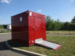 El módulo cuenta con un inodoro adaptado con barras de apoyo y un dispensador de papel, junto con un lavabo adaptado y un espejo ajustable. La seguridad y el apoyo están garantizados por barras de sujeción adicionales estratégicamente ubicadas cerca de la puerta y el lavabo. El acceso es sencillo gracias a una amplia puerta de 1900 mm de ancho con cerradura y una rampa plegable.